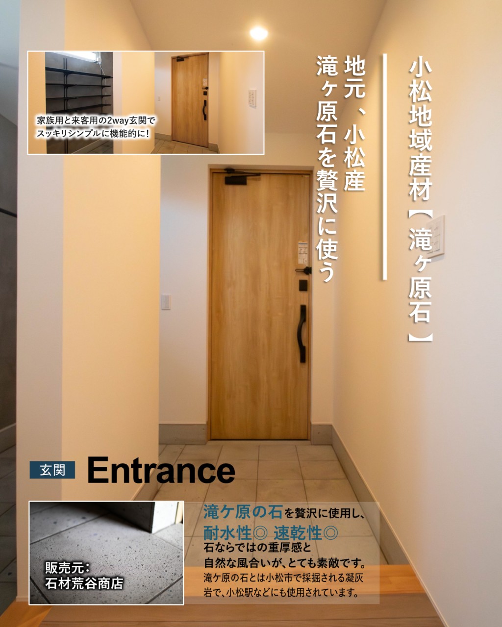 - 玄関には、石ならではの重厚感と自然な風合いが素敵な、小松産の滝ヶ原石を贅沢に使用し、耐水性・速乾性共に◎